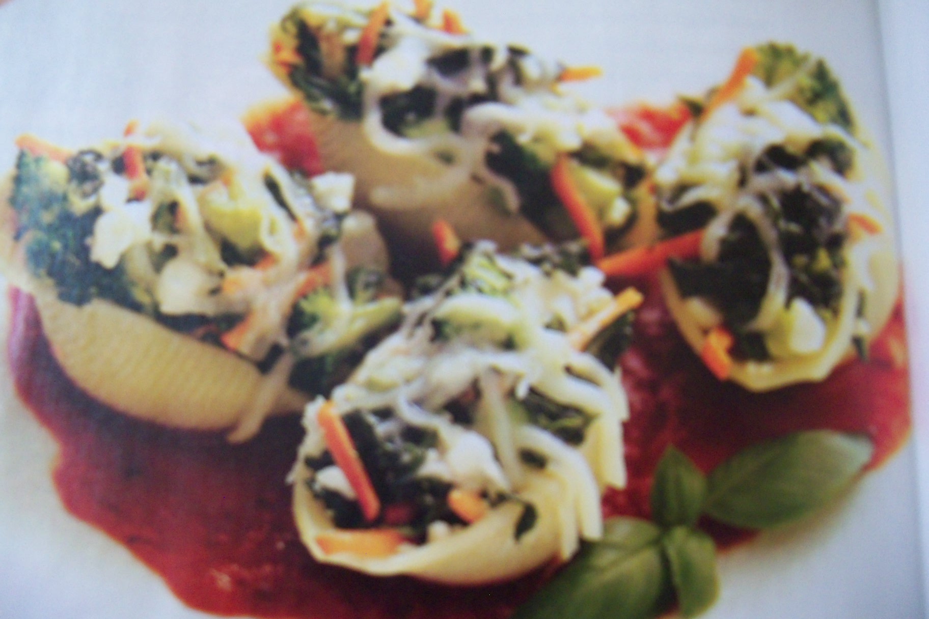 Spoon 1 rounded TBS vegetable mixture into each shell and arrange in baking dish. Sprinkle with mozzarella, cover tightly with foil and bake 35 minutes till hot and bubbly.