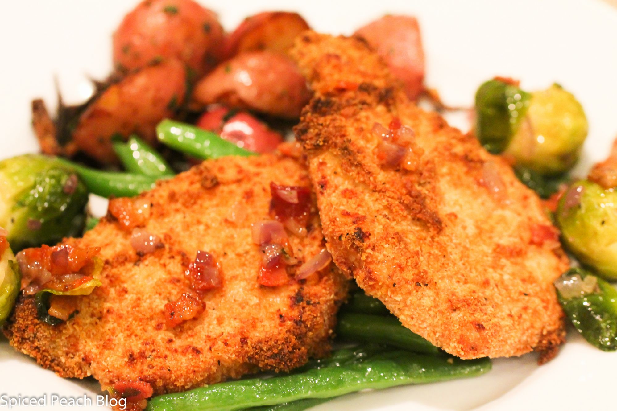 Preheat oven to 350 degrees. Combine bread crumbs, Parmesan cheese, a pinch of salt, and half teaspoon cracked black pepper in a long shallow dish, set aside. In a shallow bowl wide enough to hold a pork chop at a time, mix together the beaten eggs, water, and Tabasco sauce, set aside. In a large saute pan cook bacon pieces on medium low heat until bacon is crisp, around 6 minutes, remove bacon to a paper towel set on a plate, remove all but three tablespoons bacon grease, set the rest aside. While bacon is cooking, one thin pork chop at a time, dip chop first into egg mixture, then into the bread crumb mixture, placing dipped, breaded chop onto a baking sheet. Once chops are breaded, heat the bacon grease in the pan on very low heat, add in two tablespoons butter. Add as many pork chops to the pan as will fit without crowding. Brown pork chops until golden brown on each side, approximately three to four minutes each side, adding in a bit more butter or bacon grease if needed, returning browned chops back onto baking sheet. Finish cooking breaded pork chops in the oven,around seven minutes, or until just done and still moist, sprinkle tops with salt and pepper. Leftover bacon grease and crisp bacon pieces may be used for tossing with steamed Brussels sprouts or green beans adding a bit onto pork chops just before serving.