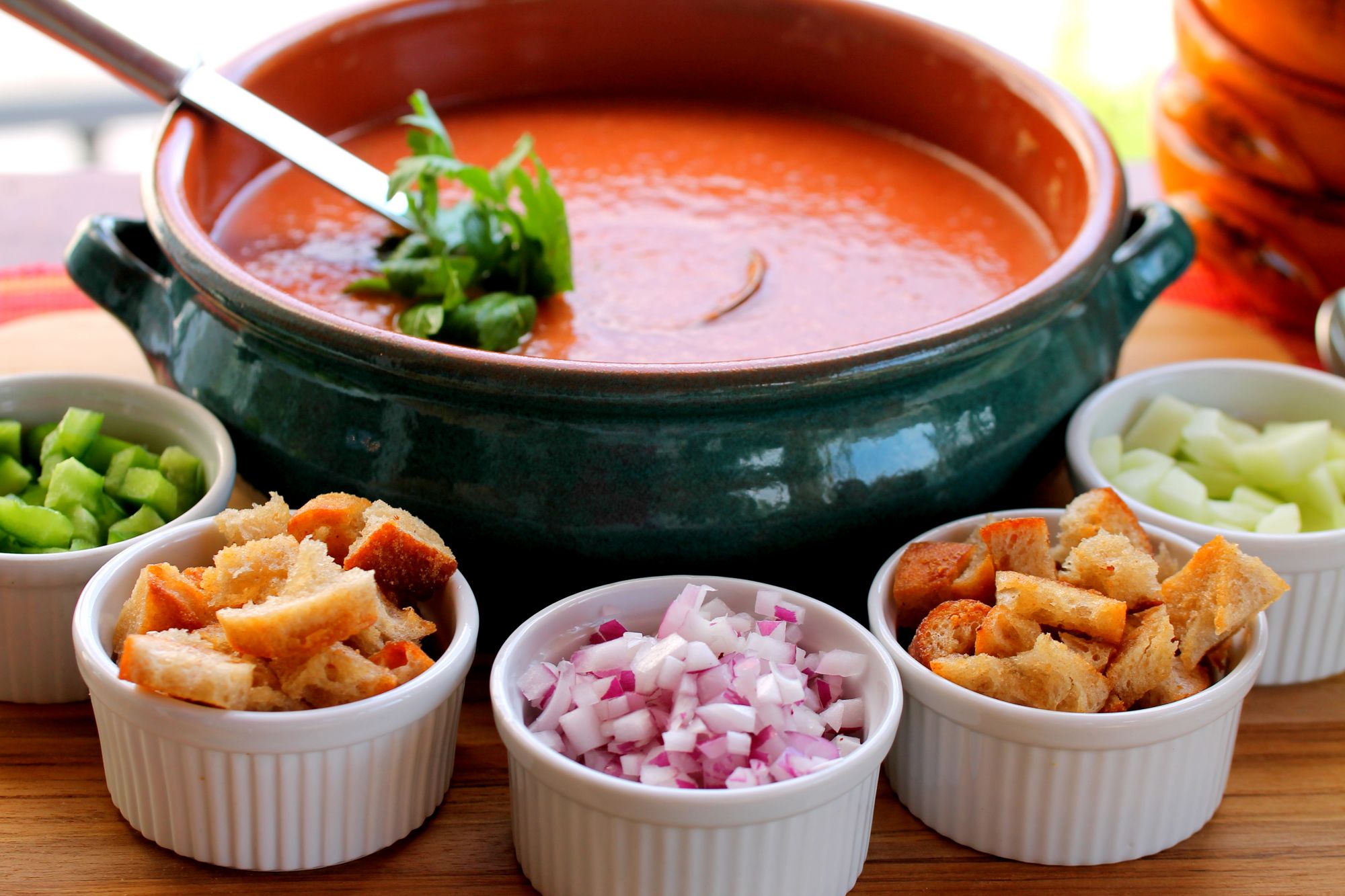 Ready up the mega power blender. Place all solid ingredients into blender then pour over V-8, Worcestershire sauce, and vinegar. Zoom, zoom, zoom until well pureed. Pour soup into a glass bowl then stir in salt, check seasoning to taste. Add in a bit more vinegar for more tang if desired. Chill, covered overnight. Serve alongside small bowls of condiments (suggestions above under Ingredients.)