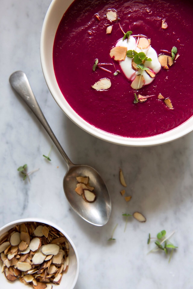 5. Let the soup cool a little and transfer to a blender to purée. Place the soup back in the pot and add the Parmesan cheese. Alter the consistency by adding more water. Bring to a simmer and adjust salt and pepper.