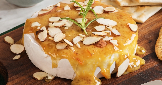 3. Spoon enough apricot jam on top of brie to cover it all over