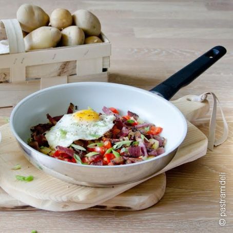 Hash – a word in English which means useless, unnecessary. However, in the culinary world it is usually the name of dishes consisting of chopped meat, potatoes and vegetables. It’s great because of its taste and also because it doesn’t take much time to prepare. The main component of this dish is prepared meat (in our case pastrami). The following recipe should not be used precisely, since you can or even should use the leftovers from your fridge. We’ve tried this for late breakfast, lunch and early dinner – it really works.