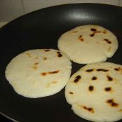 Warm up an iron skillet or a regular non sticking frying pan. Place the cornflour patties into the very hot pan: cook for about 20 minutes, turning the arepa every five minutes (low the heat after first turning). As arepas are done, put them on a plate and cover with a kitchen towel.