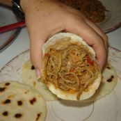 Now arepas and "carne mechada" are both on the table. Take one arepa, slice it lengthwise and fill with abundant meat. If you like it, season with Tabasco sauce.