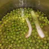 When the peas are ready, mix them with an hand blender, together with the spring onions (throw away the remaining cooking liquid). You have to get a thick cream, non a liquid one. Season with salt and black pepper to your taste.