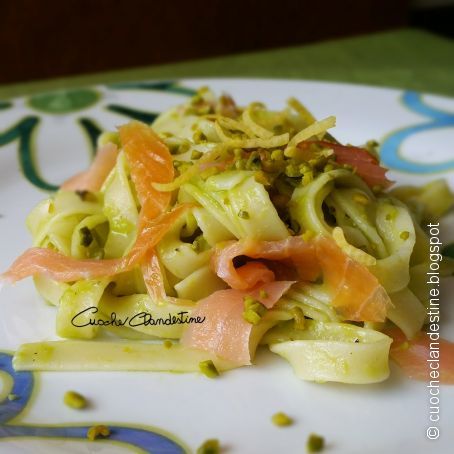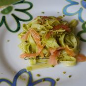Place pasta into the dishes and garnish with strips of smoked salmon. Finally add one handful of pistachios crumbs and a drizzle of extravirgin olive oil.