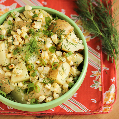 Lightened-up, tangy potato salad made with grilled corn, green onions, and fresh dill.