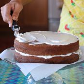 After cakes are thoroughly cooled, place one layer flat side up on a flat cake pan or stand. Spread 2/3 cup of the frosting evenly over the top. Place second layer on this and use remaining frosting for top and sides.