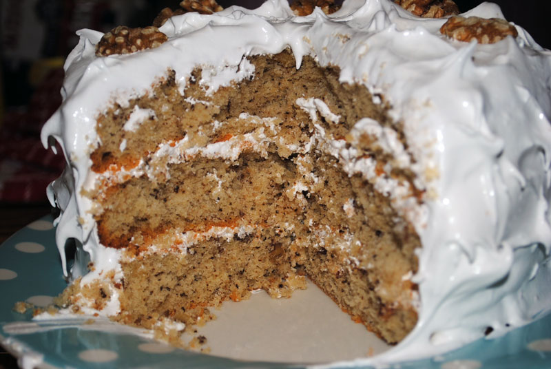 Working quickly (the icing sets rapidly), cover the top and sides of the cake with the icing, swirling the icing to form softened peaks. Leave to set in a cool place, but not in the fridge. Decorate with the caramelised walnuts.
