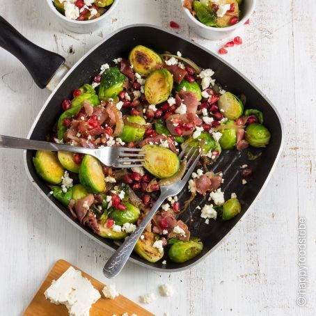 This roasted Brussels sprouts salad with prosciutto, pomegranate and Feta cheese makes a great side dish on your Holiday table!