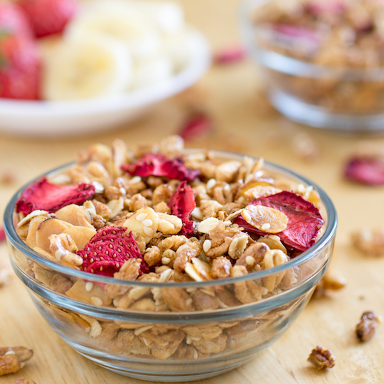 The full recipe can be found at http://www.dizzybusyandhungry.com/strawberry-granola/