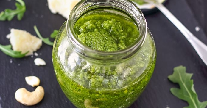 Homemade cashew arugula pesto. This pesto is made with cashew nuts, arugula leaves, garlic, extra virgin olive oil & parmesan. Perfect for pasta or canapes!