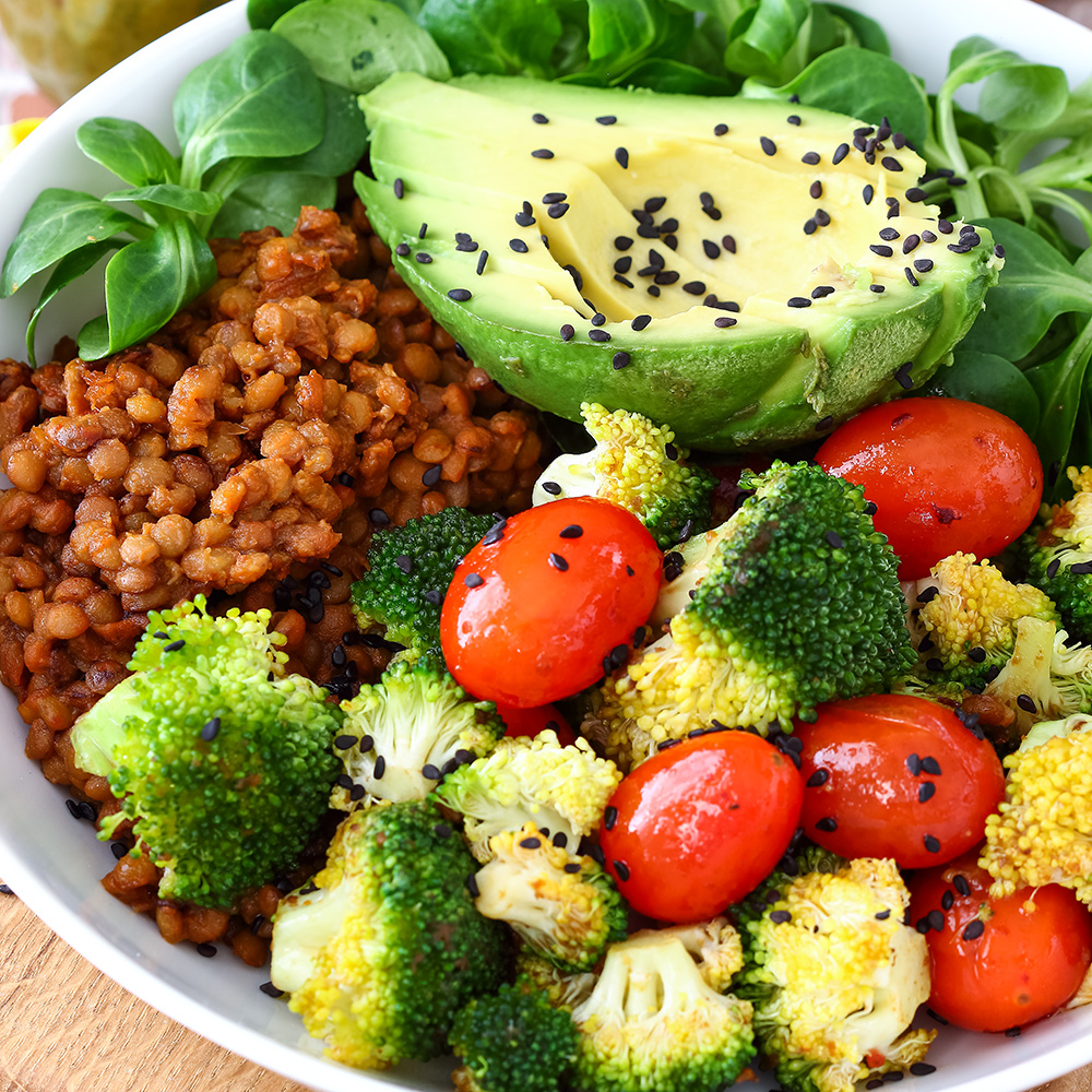 Packed with lentils, pan-roasted tomatoes and broccoli as well as fresh avocado and lamb lettuce.