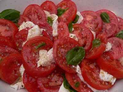 Drain the mozzarella and then cut into thin slices. Layer slices of mozzarella between each slice of tomato.