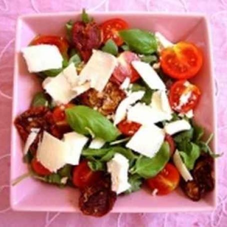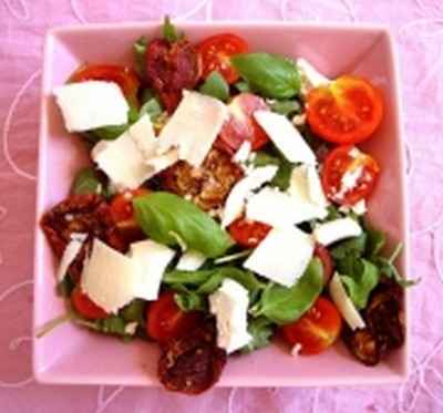 Arrange the arugula in a bowl and toss with dressing. Cut the tomatoes in two, sun-dried tomatoes, and the ricotta into chunks, put them over the salad with Parmesan shavings and basil leaves.