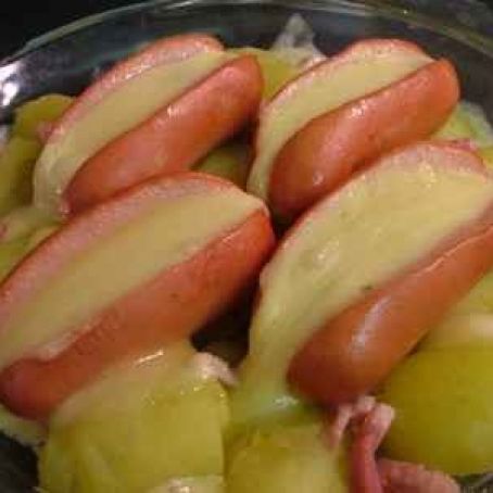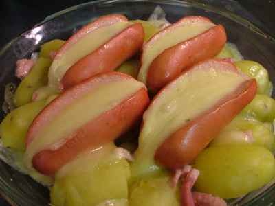 In a dish, put potatoes, peeled, halved lengthwise, sprinkle with bacon, add the sausage, which we will be stuffed with a portion of cheese.